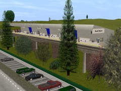 A simple stand-alone single platform monorail station based on design elements of the original Disneyland monorail station and Tomorrowland train stations.