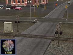This is a single-track grade-level road/rail crossing with functioning lights and older wooden crossing boards. It's designed to be used with my unmarked road YARN L2 DL0 -Si -Sh, but should work with other roads too.