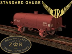 This model represents the VR WT wagon, numbers 101-205 without the 'DW' lettering (domestic water). This model has standard gauge wheel sets applied, and uses the ACS script to control couplers, brake hoses, handbrake, tail lamp and tail disc, and NumberIt to control automatic numbering. The wagon also has an animated water load and filler hatch cover.