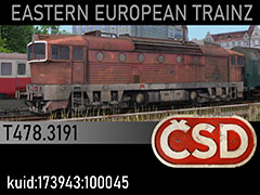 T478.3191 diesel locomotive from Mezimesti depot, 1976 state and paintscheme. This locomotive was severly damaged during a head-on collsion with another train lead by T478.3320 near Mezimesti on the 17th of June 1979. In the outcome of the crash she was decomissioned and scrapped. 3d kilanziom, photos kilanziom, textures kilanziom, script RBach. This model was tested in TS19 with fixed light script. Use view details window to control all options of the model including lights, doors and the nightview.