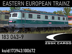 183 043-9 heavy electric locomotive owned by ZSSK Cargo. 3d kilanziom, photos Viktor Sestak, textures kilanziom, script RBach. TS12+, for any missing assets visit www.trainzart.pl - tested in TS19 with fixed light script. Use view details window to control all options of the model including lights, doors and pantographs.