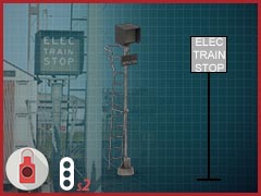 A standalone ELEC TRAIN STOP indicator. This indicator can be used in places where a diverging track is not wired and electric trains are not allowed to travel down that route. This version is mounted on the ground.