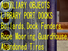 Library of minor objects for port docks, consisting of mooring bollards, port fenders of various types and sizes, ladders, abandoned wheels, mooring ropes, wooden huts o guard houses for the protection of customs and police surveillance personnel.