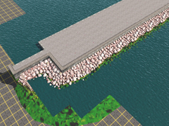 Port dock or quay on one side and breakwater on the other side, with a 60m wide and 20m high, gray cobblestones floor. Version 2. It is a SPLINE of 3 parts, beginning, middle or repetition zone and end.