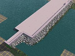 Port dock or quay on one side and breakwater on the other side, with a 60m wide and 20m high, gray 2 cobblestones floor. Version 4. It is a SPLINE of 3 parts, beginning, middle or repetition zone and end.