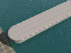 Port dock or quay on both sides, with gray cobblestones floor and curved end, 30m wide and 20m high. Version 2. It is a SPLINE of 3 parts, beginning, middle zone or repetition and end.