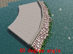 Port dock or quay on one side and breakwater on the other side, with a 60m wide and 20m high, gray cobblestones floor. Version 2. It is a fixed section curved at an angle of 60 degrees. It is the central part of a broken port at 60 degrees. The initial part of the broken port is the spline <kuid:236618:2021439> and the final part is the spline <kuid:236618:2021438>
