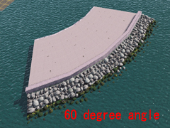 Port dock or quay on one side and breakwater on the other side, with a 60m wide and 20m high, gray 2 cobblestones (GC2) floor. Version 4. It is a fixed section curved at an angle of 60 degrees. It is the central part of a broken port at 60 degrees. The initial part of the broken port is the spline <kuid:236618:2021443> and the final part is the spline <kuid:236618:2021442>