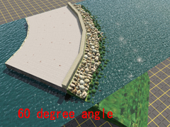 Port dock or quay on one side and breakwater on the other side, with a 60m wide and 20m high, gray concrete floor. Version 5. It is a fixed section curved at an angle of 60 degrees. It is the central part of a broken port at 60 degrees. The initial part of the broken port is the spline <kuid:236618:2021445> and the final part is the spline <kuid:236618:2021444>