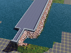 Port dock or quay on one side and breakwater on the other side, with a 60m wide and 20m high, dark asphalt floor. Version 6. It is a SPLINE of 3 parts, beginning, middle or repetition zone and end.