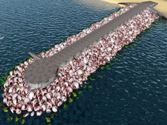 Breakwater with rock wave breakers on both sides with a concrete access in the center 10m wide and 1.8m high above the level of the rocks, for the protection of port areas. The sides with rocks have a height of 20m above the base of the terrain. Version 2e1. It is a 3-part SPLINE, beginning, middle zone (4 lods) or repetition and rounded end with a small access dock to the sea (4 lods), it is a useful area for the placement of a maritime lighthouse.