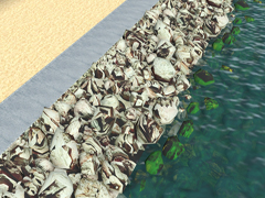 Breakwater with rock wave breakers on one side and two-part stepped stone wall on the other side, for the protection of port areas. Side with rocks with a height of 20m and side of the wall with the same height of the rock floor 20m. Version 3c. It is a SPLINE of 3 parts, simple beginning, middle zone (4 lods) or repetition and simple end.