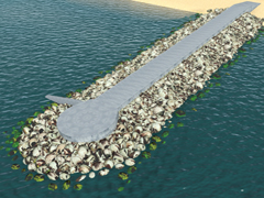 Breakwater with rock wave breakers on both sides with a concrete access in the center 10m wide and 1.8m high above the level of the rocks, for the protection of port areas. The sides with rocks have a height of 20m above the base of the terrain. Version 3e2, with a different beginning than version 3e1. It is a 3-part SPLINE, beginning, middle zone (4 lods) or repetition and rounded end with a small access dock to the sea (4 lods), it is a useful area for the placement of a maritime lighthouse.