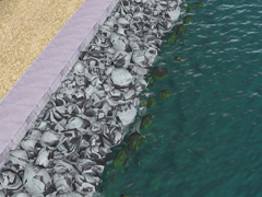 Breakwater with rock wave breakers on one side and two-part stepped stone wall on the other side, for the protection of port areas. Side with rocks with a height of 20m and wall side with a height of 22m. Version 4b. It is a SPLINE of 3 parts, simple beginning, middle zone (4 lods) or repetition and simple end.