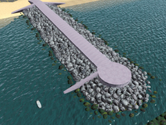 Breakwater with rock wave breakers on both sides with a concrete access in the center 10m wide and 1.8m high above the level of the rocks, for the protection of port areas. The sides with rocks have a height of 20m above the base of the terrain. Version 4e1. It is a 3-part SPLINE, beginning, middle zone (4 lods) or repetition and rounded end with a small access dock to the sea (4 lods), it is a useful area for the placement of a maritime lighthouse.