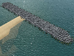 Breakwater with rock wave breakers for the protection of beaches and ports, without central concrete access, only rocks, with rounded ends and beginnings. Version 4f. It is a three-part spline, rounded start (4 lods), central or repetition zone (4 lods) and rounded end zone (4 lods).