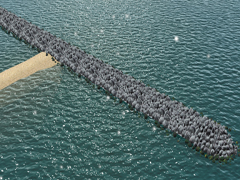 Breakwater with rock wave breakers for the protection of beaches and ports, without central concrete access, only rocks, with rounded ends and beginnings. Version 4g, it is half the size of version 4f. It is a three-part spline, rounded start (4 lods), central or repetition zone (4 lods) and rounded end zone (4 lods).