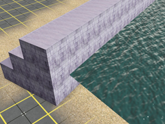 Breakwater with only three-part staggered stone walls on one side and a vertical wall on the other side, (without rocks) for the protection of port areas. Wall with a height of 18m and a base of 24m wide. Version 4i. It is a 3-part SPLINE, beginning, middle or repetition zone and end. It could be used as a port dock or a dam retaining wall.