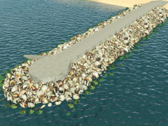 Breakwater with rock wave breakers on both sides with a concrete access in the center 10m wide and 1.8m high above the level of the rocks, for the protection of port areas. The sides with rocks have a height of 20m above the base of the terrain. Version 5e2, with a different beginning than version 5e1. It is a 3-part SPLINE, beginning, middle zone (4 lods) or repetition and rounded end with a small access dock to the sea (4 lods), it is a useful area for the placement of a maritime lighthouse.
