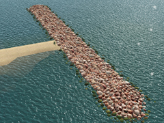 Breakwater with rock wave breakers for the protection of beaches and ports, without central concrete access, only rocks, with rounded ends and beginnings. Version 6f. It is a three-part spline, rounded start (4 lods), central or repetition zone (4 lods) and rounded end zone (4 lods).