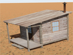 Small wooden house, old west style, with chimney and smoke, no night mode. Dimensions: 3m x 3m. Version 0F