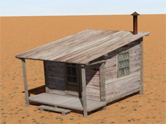 Small wooden house, old west style, with chimney and smoke, no night mode. Dimensions: 3m x 3m. Version 0G