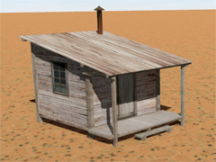 Small wooden house, old west style, with chimney and smoke, no night mode. Dimensions: 3m x 3m. Version 0H