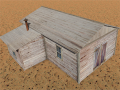 Wooden shed with side annex, old west style, with chimney and smoke, no night mode. Dimensions: 6m x 10m + 4m x 3m. Version 4J