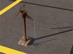 Metallic manual water pump, with a small trickle of water coming out of the pump, in the style of the old west. It has 4 meshes or lods. Version 2B