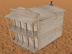 Two-story, old-west-style wooden house with stairway and balcony, with chimney and smoke, it has no night mode. Dimensions: 6m x 6m. Version 8A