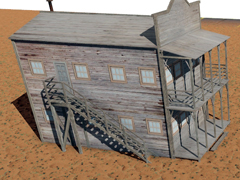 Two-story, old-west-style wooden house with stairway and balcony, with chimney and smoke, it has no night mode. Dimensions: 6m x 10m. Version 9B