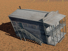 Two-story, old-west-style wooden house with stairway and balcony, with chimney and smoke, it has no night mode. Dimensions: 6m x 10m. Version 9E