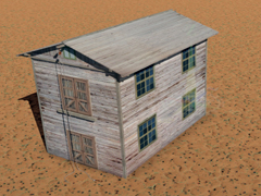 Two-story, old-west-style wooden shed, with pulley and rope with hook, for loading goods. No night mode. Dimensions: 6m x 10m. Version 9I2