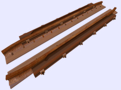 It is a track object: To make railway crossings (diamond junction or diamond crossing) at the same level. Length 2.4m, rail gauge 762mm, with 6 bolts with union screws from the rail to the check rail (model B) every 40cm. Version or finish 1. For straight track and level with the ground. With spikes on the checkrails. Rail crossing designed for rail 30kg per meter, approximately 60.5 pounds per yard, suitable for medium rail. Rail 12 cm high. New version with the addition of the ''follow-gradient 1'' tag, to adapt to the inclinations of the railway track.
