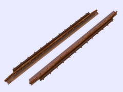It is a track object: To make railway crossings (diamond junction or diamond crossing) at the same level. Length 5m, rail gauge 1067mm, with 13 bolts with union screws from the rail to the check rail (model B) every 40cm. Non-symmetric check rails at 45º. Version or finish 1. For straight track and level with the ground. Rail crossing designed for UIC rail 60kg per meter, approximately 121 pounds per yard, not suitable for light rail. Rail 16 cm high. New version with the addition of the ''follow-gradient 1'' tag, to adapt to the inclinations of the railway track.