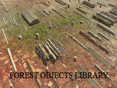 Library of objects from a forestry operation or industry, composed of pieces of wood, bark, branches, cut trees, stumps, trunks and logs. Contains meshes and textures.