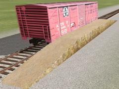 Loading dock with initial and final ramps for freight wagons, 12m long, 2m wide and 1.2m high, with stone side walls and earth center. It is a scenic and decorative object. It is not functional or interactive.