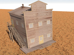 Two-story high wooden house, in the old west style, with a side staircase leading to the second floor. Building similar to version 8 but without a balcony facing the street. With chimney and smoke, it does not have night mode. Dimensions: 6m x 7m. Version 12A1. In this version the wood textures are gray