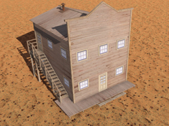 Two-story high wooden house, in the old west style, with a side staircase leading to the second floor. Building similar to version 8 but without a balcony facing the street. With chimney and smoke, it does not have night mode. Dimensions: 6m x 7m. Version 12B1. In this version the wood textures are gray