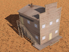 Two-story high wooden house, in the old west style, with a side staircase leading to the second floor. Building similar to version 8 but without a balcony facing the street. With chimney and smoke, it does not have night mode. Dimensions: 6m x 7m. Version 12C1. In this version the wood textures are gray