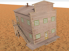 Two-story high wooden house, in the old west style, with a side staircase leading to the second floor. Building similar to version 8 but without a balcony facing the street. With chimney and smoke, it does not have night mode. Dimensions: 6m x 7m. Version 12G1. In this version the wood textures are gray