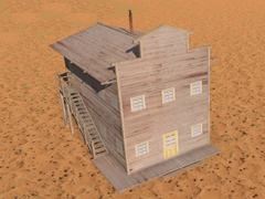 Two-story high wooden house, in the old west style, with a side staircase leading to the second floor. Building similar to version 9 but without a balcony facing the street. With chimney and smoke, it does not have night mode. Dimensions: 6m x 10m. Version 13A1. In this version the wood textures are gray