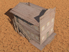Two-story high wooden house, in the old west style, with a side staircase leading to the second floor. Building similar to version 9 but without a balcony facing the street. With chimney and smoke, it does not have night mode. Dimensions: 6m x 10m. Version 13E1. In this version the wood textures are gray