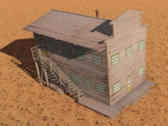Two-story high wooden house, in the old west style, with a side staircase leading to the second floor. Building similar to version 9 but without a balcony facing the street. With chimney and smoke, it does not have night mode. Dimensions: 6m x 10m. Version 13G1. In this version the wood textures are gray