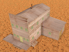 Two-story high wooden house, in the old west style, with a side staircase leading to the second floor. Building similar to version 10 but without a balcony facing the street. With chimney and smoke, it does not have night mode. Dimensions: 6m x 12m. Version 14D1. In this version the wood textures are gray