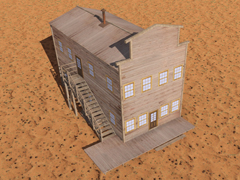Two-story high wooden house, in the old west style, with a side staircase leading to the second floor. Building similar to version 10 but without a balcony facing the street. With chimney and smoke, it does not have night mode. Dimensions: 6m x 12m. Version 14F11. In this version the wood textures are gray