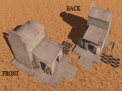 Two-story high wooden house, in the style of the old west, with a side staircase to access the second floor and an attached warehouse. With chimney and smoke, it does not have night mode. Building dimensions: 6m x 7m, and the warehouse 6m x 6m. Version 15A1. Building used as a funeral home, without exterior advertising signs. With coffins on display and lumber for construction. In this version the wood textures are gray