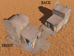 Two-story high wooden house, in the style of the old west, with a side staircase to access the second floor and an attached warehouse. With chimney and smoke, it does not have night mode. Building dimensions: 6m x 7m, and the warehouse 6m x 6m. Version 15B1. Building used as a funeral home, without exterior advertising signs. With some coffins on display in a simple version. In this version the wood textures are gray