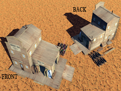 Two-story high wooden house, in the style of the old west, with a side staircase to access the second floor and an attached warehouse. With chimney and smoke, it does not have night mode. Building dimensions: 6m x 7m, and the warehouse 6m x 6m. Version 15C1. Building used as a funeral home under the name of Alan Benson, (Fictitious name). With coffins on display and lumber for construction. In this version the wood textures are gray