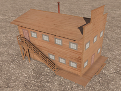 Two-story high wooden house, in the old west style, with a side staircase leading to the second floor. Building similar to version 9 but without a balcony facing the street. With chimney and smoke, it does not have night mode. Dimensions: 6m x 10m. Version 13C2. In this version the wood textures are reddish-brown